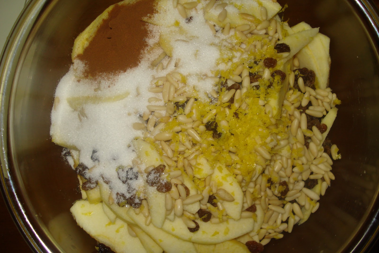 Pelare le mele e tagliarle sottilmente e metterle in una ciotola con l'uvetta strizzata,i pinoli,la scorza del limone,lo zucchero e la cannella.